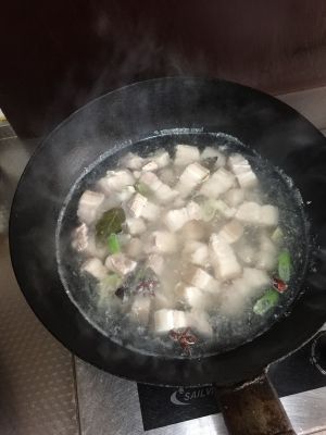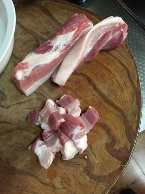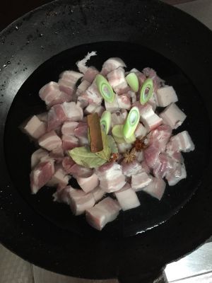 不好意思各位,做时忘了拍照了,先把五花肉煮下,去血水,捞起切麻将一半的大肉块,蒜姜切片,干辣椒切段,八角,糖准备好