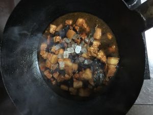 加入老抽,耗油,料酒,八角,少量盐,蒜瓣,翻炒均匀后,加水,这里可以多加一点,让肉多炖煮一下,这样瘦肉部分比较容易烂。因为家里锅不够用,我后来是放在电饭煲里继续煮的。