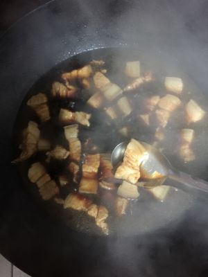 上色后,加入适量清水,水末过五花肉,大火烧开后转小火,煮40分钟左右,最后还剩一点水的时候,开大火收汁。将八角,桂平,香叶等配料捞出。