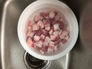 将五花肉切小块,烧开水放入锅中,加入2勺料酒,生姜,煮出泡沫捞出洗净,控干水分。