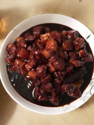 在锅中加入油,加入冰糖敖色,后加入煮好的肉,同时加入预先调好的汁(生抽、老抽、醋、盐、味精等)翻炒一会加入适量水与肉平齐,盖锅大火炖10分钟,汤汁加入葱姜蒜枣和炖肉料,汤烧干后大火收汁