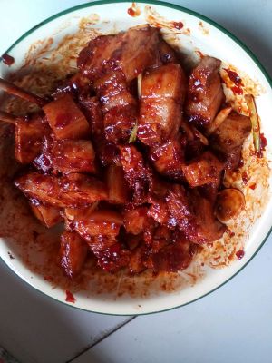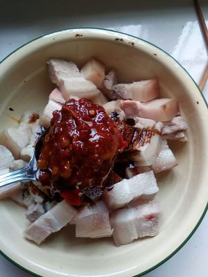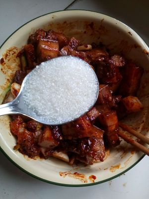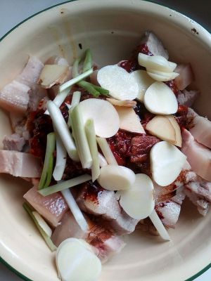 腌制过程中需要翻几次,方便均匀入味。20分钟后,热锅放油,油开后放入拌料时剩下的葱姜蒜爆香,倒入腌制好的五花肉,翻炒,调整火候,将肉炸至金黄色,加水(水漫过肉多一点),猛火烧开,调至小火,将汤汁煨干。