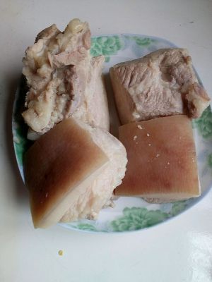 等到肉煮到脂肪层略透明,捞起,冲水冲干净浮沫
