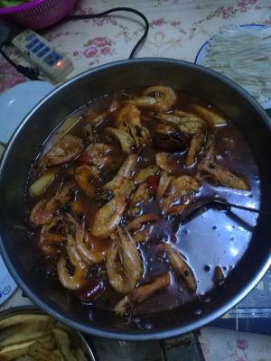 葱姜蒜爆香,加入老干妈、豆瓣酱,小火炒出豉油,然后再倒入虾(家里老干妈、豆瓣酱用完了,用的自制辣椒油所以后加的)