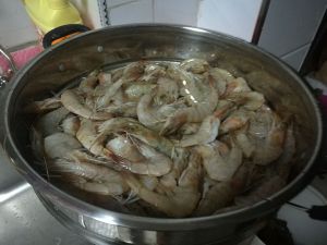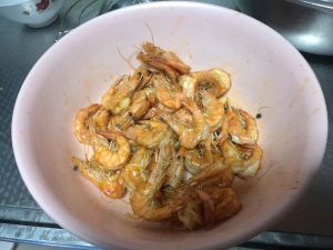 虾化冻,去虾线,清洗,空干水份。
