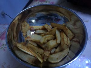 薯条炸好、控油。