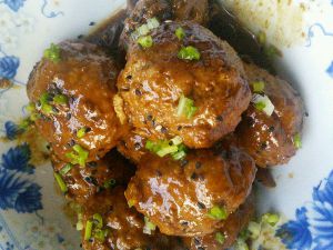 然后用手捏握出丸子备用,锅中倒入适量油,烧至七成热,放入肉丸子,炸至外表呈金黄色,捞出沥油