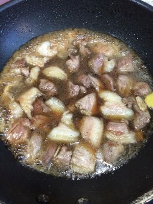 锅中倒少许油,小小火化开冰糖炒糖色,炒糖色时需要不停翻炒以防粘锅有焦苦味,至冰糖全部融化为止。倒入五花肉,改中火快速翻炒,至肉上色为止,接着快速倒入姜片炒香