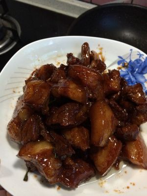 锅烧热,把五花肉油炸一下,加点水放点冰糖,烧3分钟,加点生抽酱油蚝油翻炒。最后把香芋加进去,翻炒一下,煮1分钟,样子很难看,但味道还不错