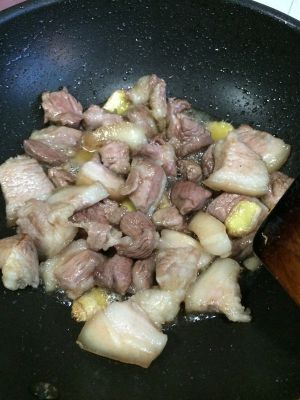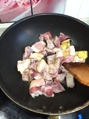 放入姜片翻炒两下(真的是两下噢~),放入切好沥干的肉块(老公喜欢吃瘦肉~所以我的肉肉比较瘦)。