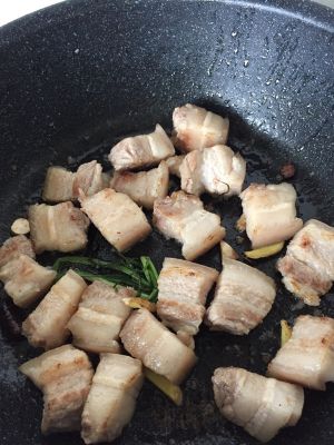 沥干水后,锅里加少许油,煸炒小葱和姜丝及五花肉。炒到肉表面微黄香味出来。加泡过的香叶桂皮,再加冰糖(依个人口味)炒下稍上色,糖色不大会炒,这样保险一点。