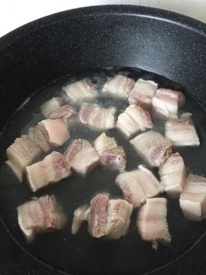 先在锅里加水焯一下肉,焯好之后就洗肉,切好。