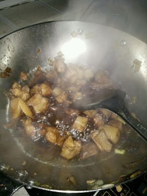 热锅冷油,放肉块炒成金黄色,加入酱油,翻炒均匀,再加入土豆,加水焖煮收汁即可