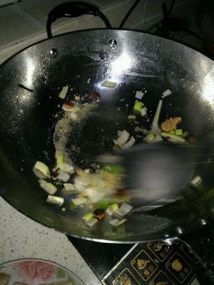 加糖炒变色;将葱姜、八角、干辣椒爆香,翻炒五花肉(炒出多余的油脂)。