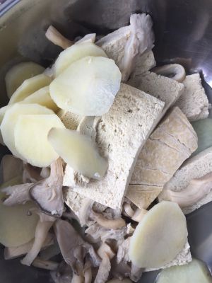 将冻豆腐、蘑菇、土豆片放盐水里煮熟捞起放置盆中