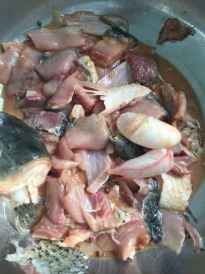骨肉分离后,鱼肉拿酱油,盐巴,花椒粉淀粉腌制二十分钟。