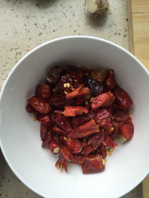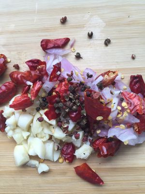 老姜,大蒜切成末。干红辣椒用手撕碎。花椒粒,八角(可以不要)