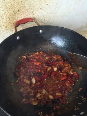 吵料,加入三大勺郫县豆瓣,放入大葱等吵料