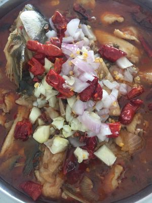 因为接下来比较忙,就不能一一拍照了。先将锅加热,放入50克菜籽油。等菜油8分熟,放入花椒粒,干辣椒,姜,蒜末。翻炒出香味,然后放入豆瓣酱翻炒出红油加入鱼头和鱼骨,大葱,芹菜段,再加入500克汤,大火煮开,放入鸡精,再熬10分钟。
