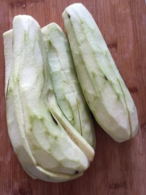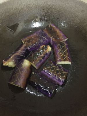 茄子切成如图样子。然后锅里上油煎熟茄子