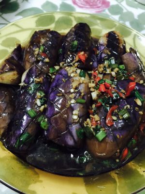 3、将茄子放入蒸锅中蒸熟?6?5用筷子扎?6?5感觉里面软就可以。将茄子排在盘中淋上调好的味汁即可。