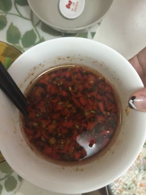 小米辣、蒜蓉放碗里,油锅里的油热了以后浇进碗里。如图放入酱油、糖、盐等调好酱料。