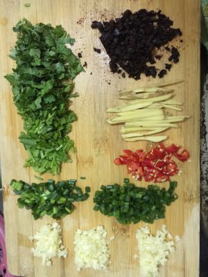 大蒜切蒜蓉、葱花、小米辣切碎。(图上是几道菜的配料,供参考)