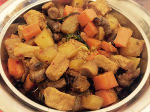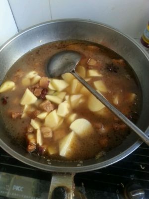 肉烂了后,加了点红薯,可以减少油腻感,加入白糖。大火烧开后,小火慢炖,肉质才会柔滑,不加水味道更好,所以不用加水,小火最好