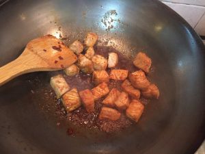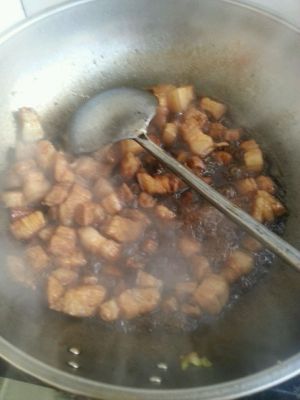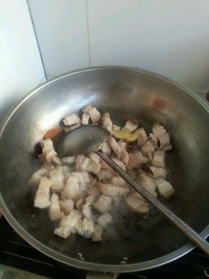 热锅,放油。将切好的肉块放入翻炒,等肉变色后,加入适量酱油,再翻炒几下。
