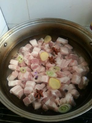 五花内洗净切方块,姜洗净切片,葱切段。
