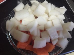 白萝卜,胡萝卜去皮,洗净,切块备用。