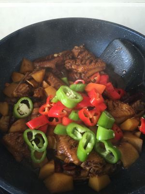 等到土豆、胡萝卜熟了后,看到汤汁有一些粘稠度,就可以转到大火放入青椒翻炒收汁啦。