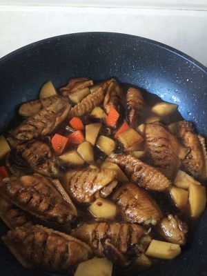 把切好块的土豆,胡萝卜,香菇铺在鸡翅上。