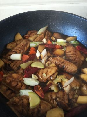 再放一些葱、姜、蒜、干辣椒,搅拌一下,盖上锅盖,转到小火开始等待吧。