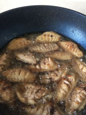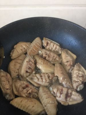 锅中倒入少量油,等油热后,将控干水的鸡翅下锅煎至两面微黄。(鸡翅下锅后要立即把锅盖盖上,不然油会崩的到处都是,惨痛的经历~~~)