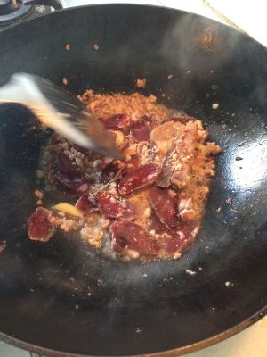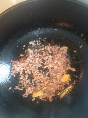 放油,热锅,放入肉沫爆一爆,再放入几片生姜去腥,放一点黄酒。