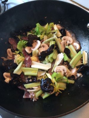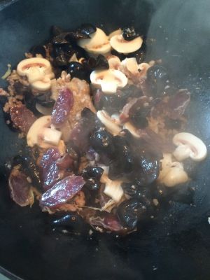 放入事先浸泡好的黑木耳,以及切好片的白蘑菇,翻炒片刻。放入盐,再放点糖提鲜,翻炒均匀。