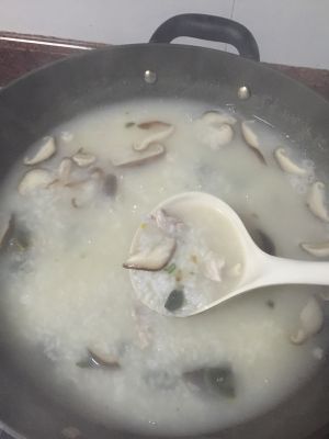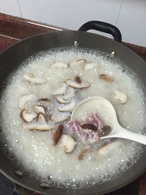 粥煮至粘稠状,放入皮蛋,肉,姜丝,盐,继续小火熬煮