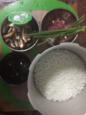 所需材料准备好,香菇切片(或切丁)肉丝,皮蛋,煮好的饭(我用煮粥的米)