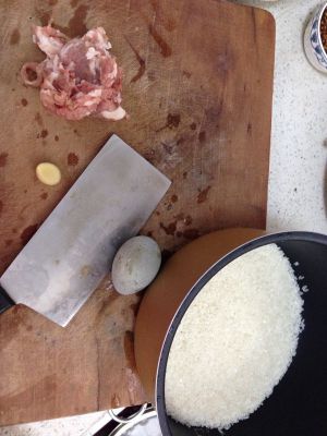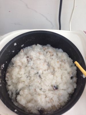 水开后加入腌好的大米,在煮的过程中要时不时搅一搅,以免糊底。米煮到稍微粘稠,加入焯好的肉和三分之二的皮蛋丁,再加入一半葱花。 再煮约五分钟左右加入剩下的皮蛋和葱花,加入盐、鸡精和少量酱油