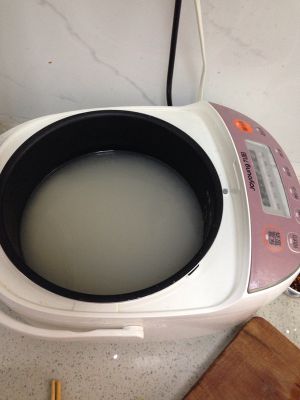 电饭锅里添4碗水,加热。三分之二碗的大米洗净,加入少许盐和油腌制10分钟备用