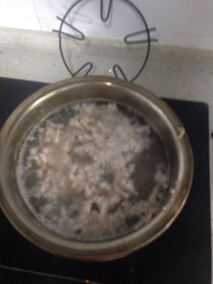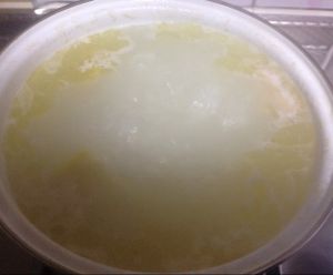 平时洗干净的煲,到要用时都会再冲洗一次,放两杯米进去洗干净,洗两遍,就加适量的水,盖上锅盖大火煮沸,在过程中要用勺子搅拌一下,免得粘锅,米会起团
