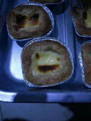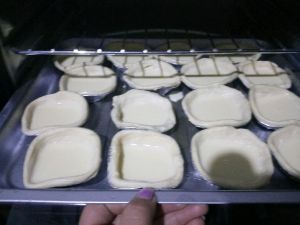 然后装进蛋挞皮里,装八分就可以,蛋挞皮有点化了,所以皮都不好了,用了16个蛋挞皮,最后蛋液有些不够,烤箱我提前预热了15分钟220