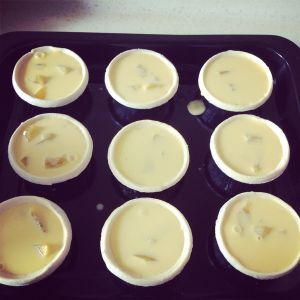 将过滤好的挞水放入准备好的挞皮中,将黄桃刚好盖过