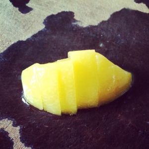 拿出黄桃来,将一大块的切成小块(不要黄桃罐头里头的糖水,对身体没好处,而且烤的时候会有水溢出)我这里用了9块黄桃,一个蛋挞一块黄桃,不是特别喜欢黄桃的可以换成一块黄桃两个蛋挞皮装。 放入蛋挞皮里