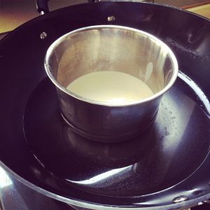 隔水加热,将白砂糖完全融化的时候将火熄灭,放置冷却
