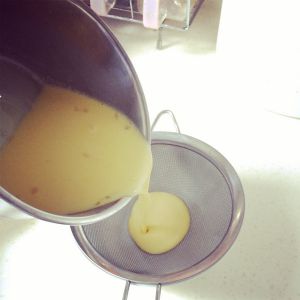 将搅拌好的挞水用滤网过滤,这样可以滤掉打不散的蛋粒和粉粒,烤好的蛋挞表皮才会光滑。注意要在滤网上多搅动几下,直至水份完全滤掉。