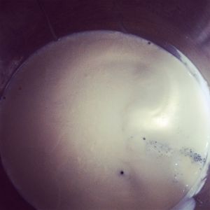 蛋黄打散,倒入冷却后的奶液中,记得要边倒边搅哦,直到完全搅拌均匀。