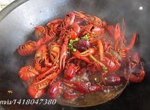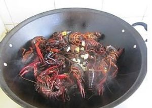 坐锅热油,放姜片、花椒、辣椒炝锅。油热,依次放葱白、小龙虾和蒜头炒,加少许盐