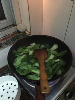 最后倒入油菜,翻炒。因为妈妈胃不好所以炒的久一点,软烂的菜更容易消化。